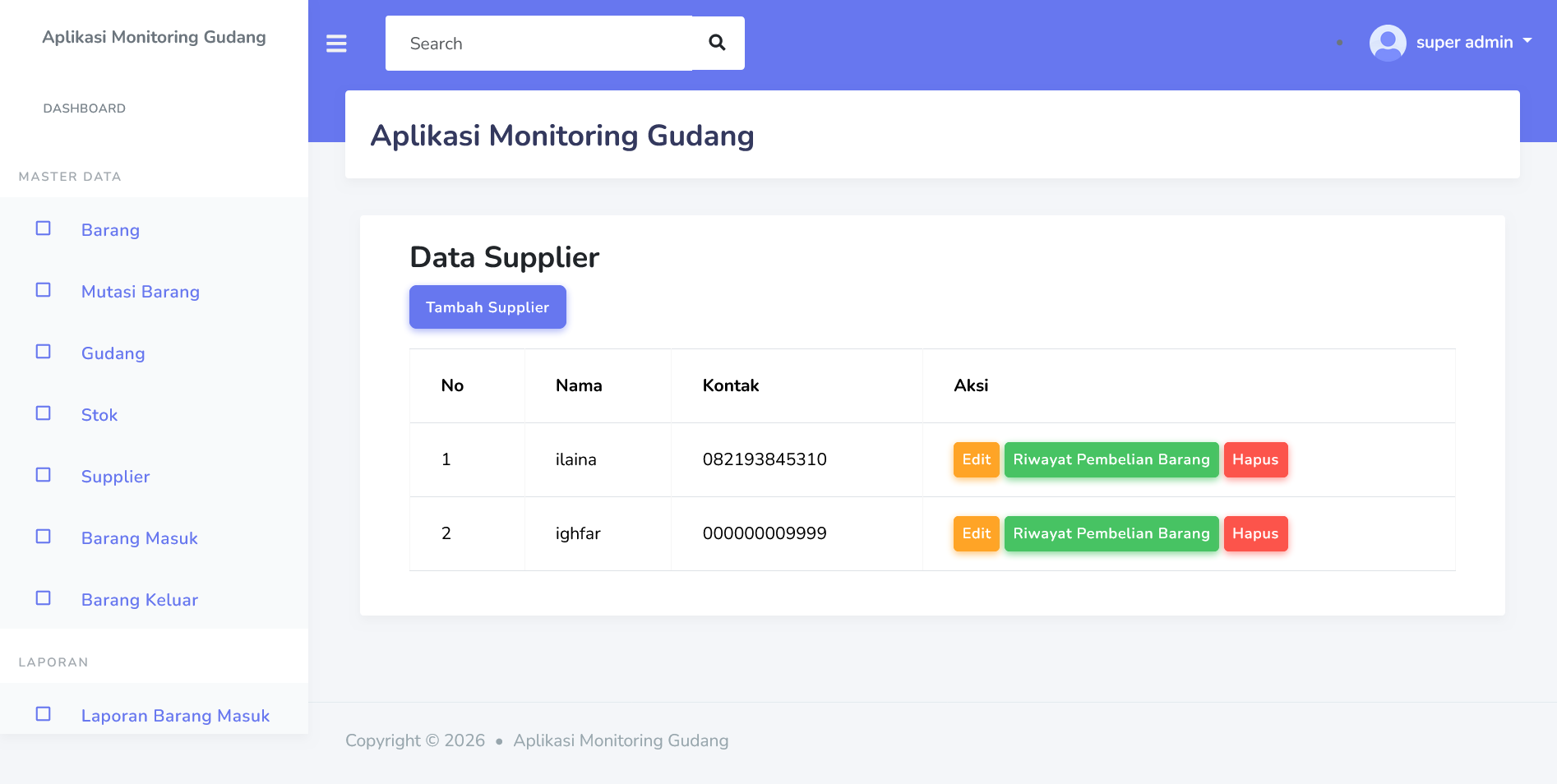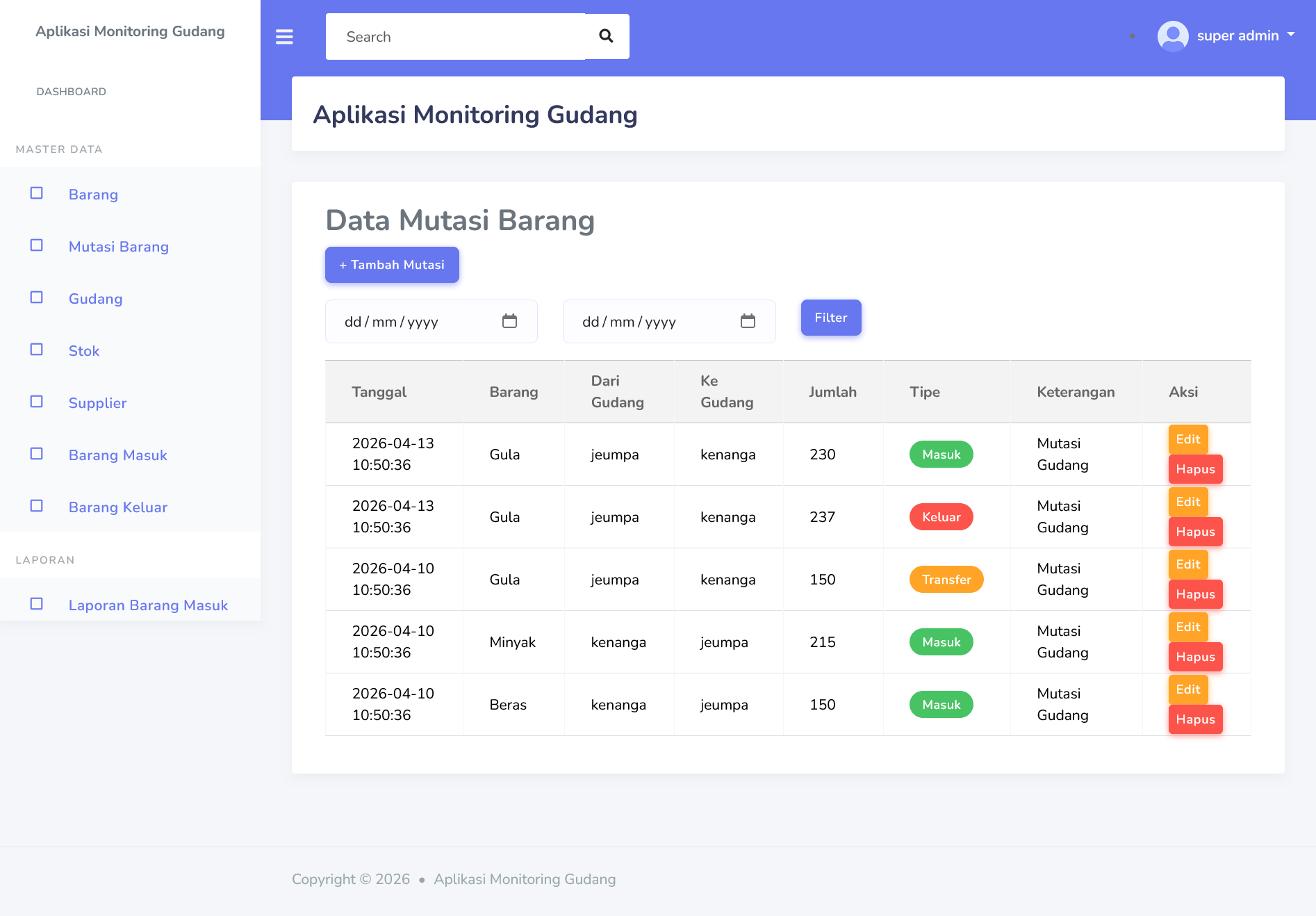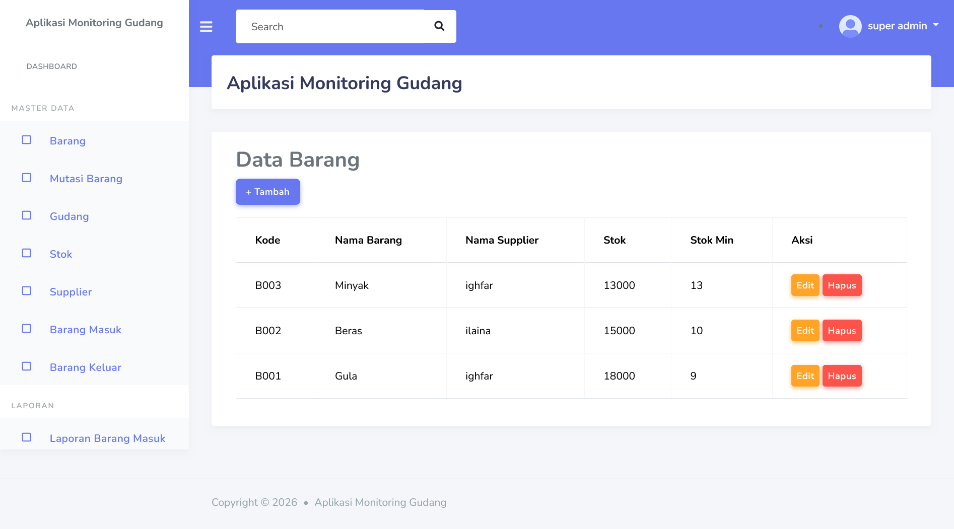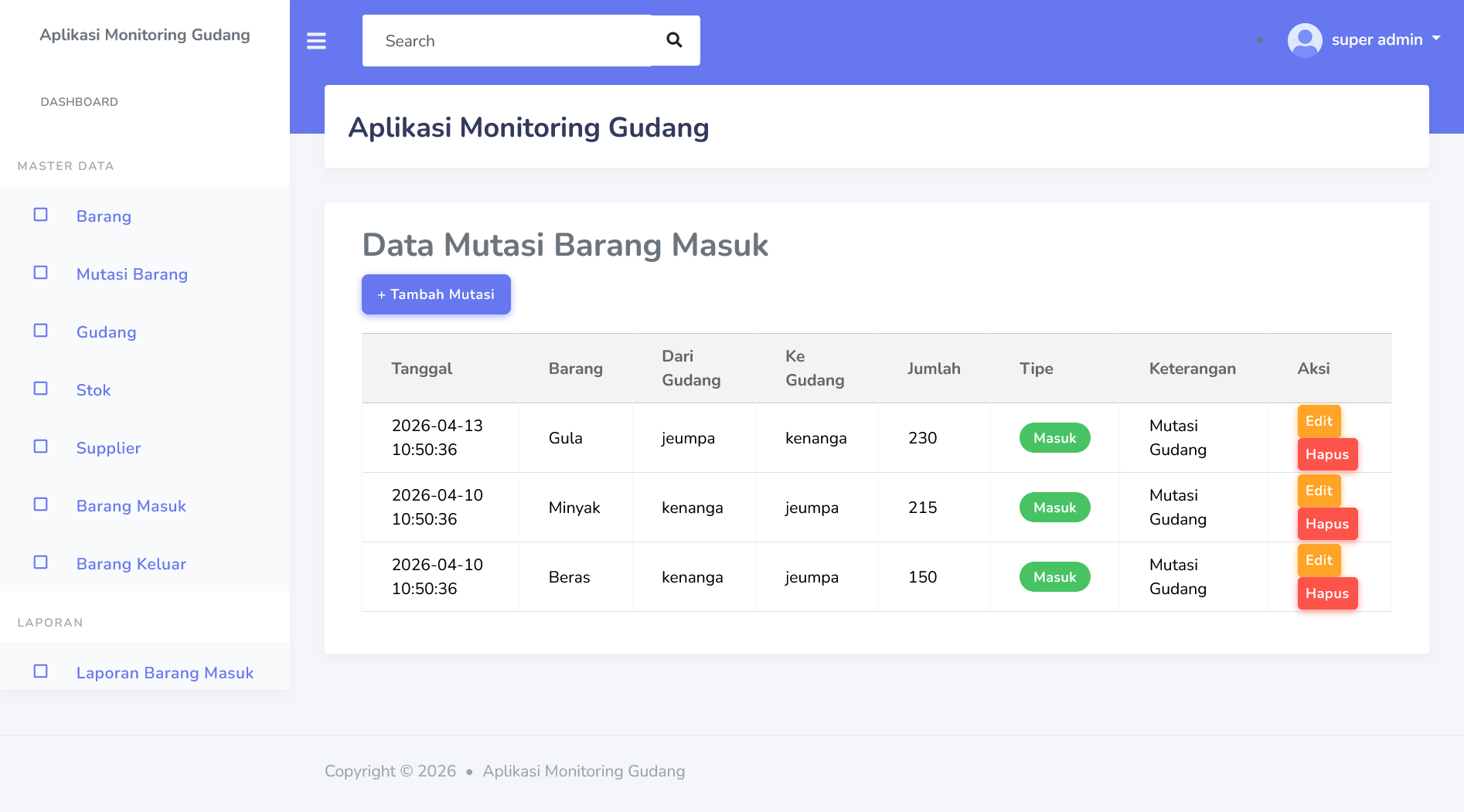 Sistem digital untuk memantau stok barang, aktivitas gudang, dan laporan inventori secara real-time.